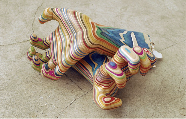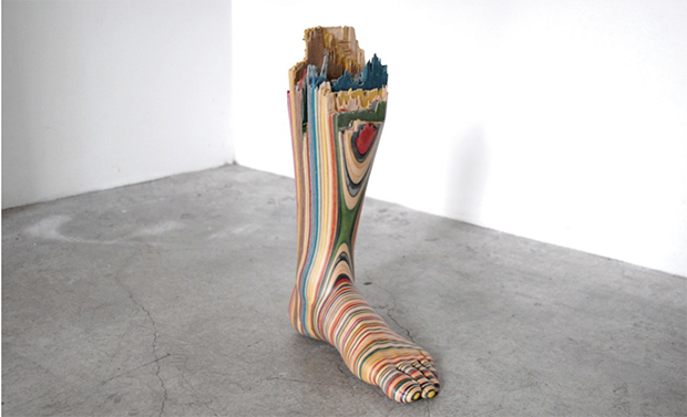 O artista asiático Haroshi é skatista e marceneiro, em ambos autodidata, e vem se tornando cada vez mais conhecido pela suas impressionantes esculturas feitas de shapes de skates reciclados transformados em esculturas.