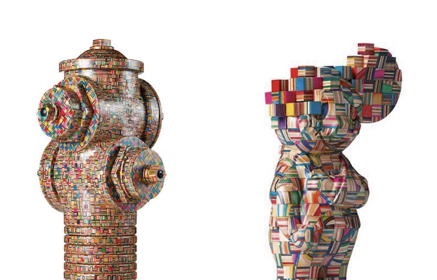 Hiroshi utiliza de uma técnica de processamento das madeiras do shapes a fim de obter finas camadas que são combinadas em esculturas de pop art.