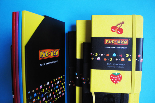 Depois da notícia do Moleskine em comemoração dos 60 anos dos Peanuts, agora é a vez dos 30 anos do jogo super anos 80, o Pac Man. Para a data será lançado um set com as capas estampadas pelos personagens: frutinhas, fantasmas, etc. Mais um pra coleção!