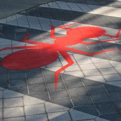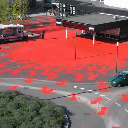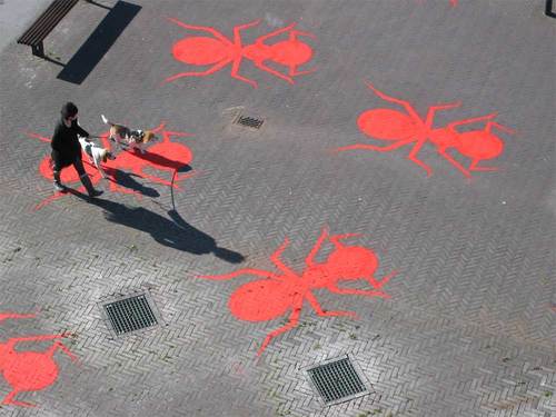 Cerca de 500 formigas vermelhas foram espalhadas pelo artista Henk Hofstra na cidade de Drachten, na Holanda. A maioria se concentrava em frente ao teatro De Lawei, presente do artista aos 50 anos de existência do local.