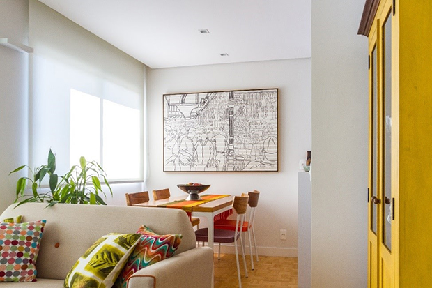 Os mobiliários podem ser aliados na estratégia de ampliar a circulação. Em imóveis pequenos, a marcenaria planejada provê soluções que móveis soltos não conseguiriam trazer. “Em aptos com 40m², é impensável não considerar a marcenaria sob medida, que nos ajuda a resolver questões como a falta de espaço e organização”, detalha Camila. Armários e prateleiras instalados acima das portas (e fora do olhar) e a substituição de uma porta de abrir por um modelo de correr também são formas de liberar a circulação.