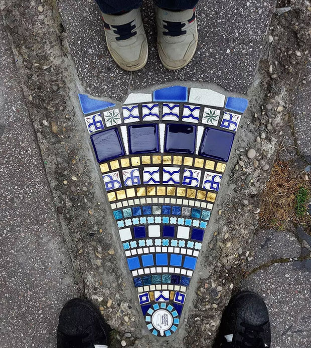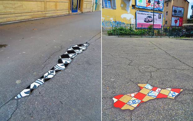O artista Ememem encontrou uma maneira única de lidar com rachaduras e buracos na rua: ele transforma falhas em arte