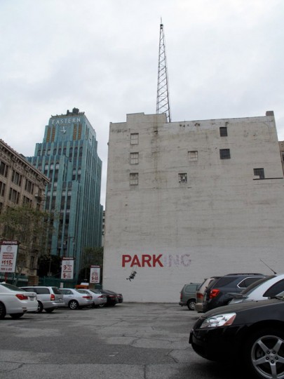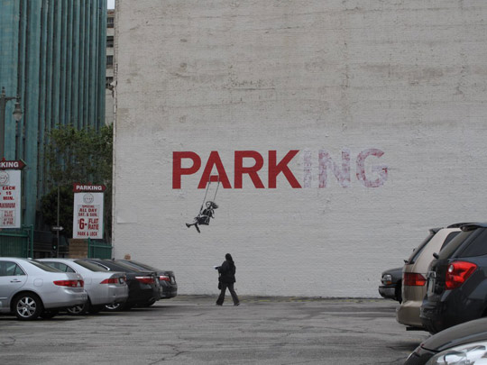 Depois do premiere do seu filme “Through the Gift Shop”, BANKSY voltou com toda criatividade. Em passagem por Los Angeles fez mais um de seus stencils. Desta vez, uma menina em um balanço, “brincando” com a palavra Parking, que foi cortada para Park… Como sempre, amazing!