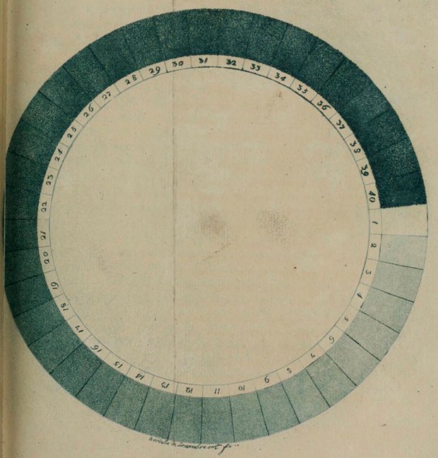 Mas como medir o ‘azulado’? Usando suspensões de azul da Prússia, o papel tingido de Saussure formava quadradinhos de cada tom que ele conseguia distinguir as nuances. Assim, eram reunidos em um círculo de cores numerado que podia ser erguido até a distância padrão do olho – e o quadrado correspondente estabelecia o grau de azul.