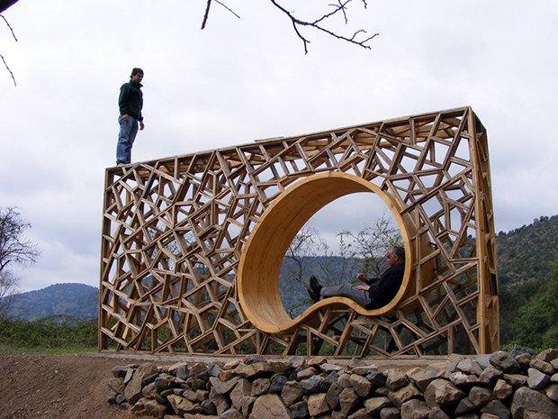 Pegamos por exemplo, uma dessas construções de 10m2 intitulada de “Marco”. Este trabalho fez parte do processo de qualificação da Universidade de Arquitetura. Marcelo Valdes e Osvaldo Velizonde abordaram os diferentes problemas territoriais do Chile Central e criaram um tipo de mirante como um marco de rota.