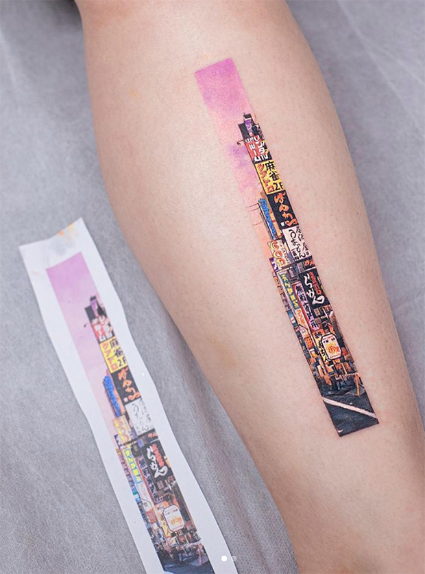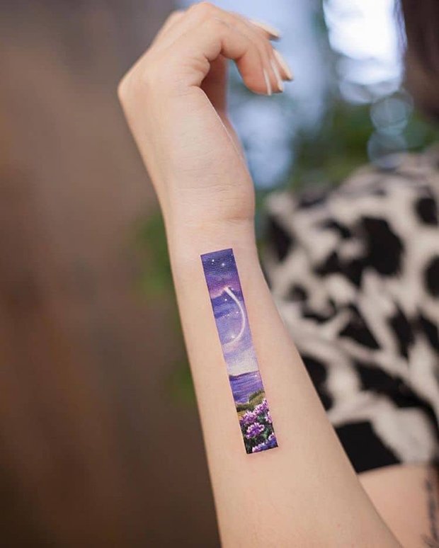 A tatuadora de Pequim Franky Yang cria sua arte inspirada nas pinturas tradicionais chinesas. Como janelas para outro mundo, cada pequena obra na pele contém uma de suas ilustrações dentro de retângulos longos e finos, que se estendem por braços, pernas e torsos de seus clientes. Dentro dessas formas geométricas estão visões detalhadas de encostas rochosas, florestas exuberantes e paisagens marinhas cintilantes.