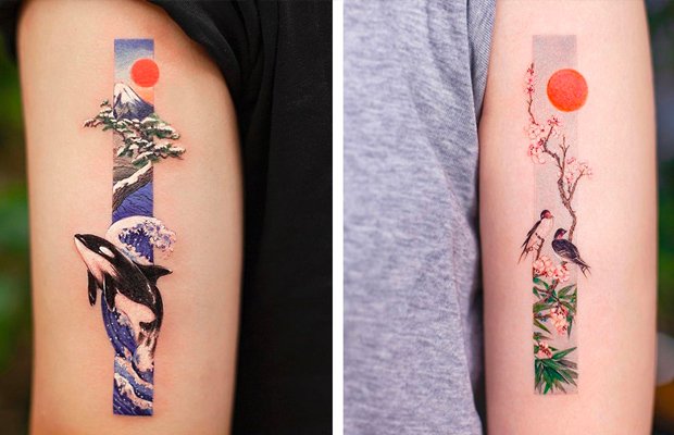 De peixes a sóis escarlates e galhos de árvores cheios de flor, esses toques sutis adicionam uma energia especial às tattoos formatadas. Algumas de suas tatuagens mais ambiciosas incluem vários elementos da natureza, como uma orca pulando do oceano com ondas tumultuadas, flores se destacando sobre pedras no oceano e muito, muito mais.