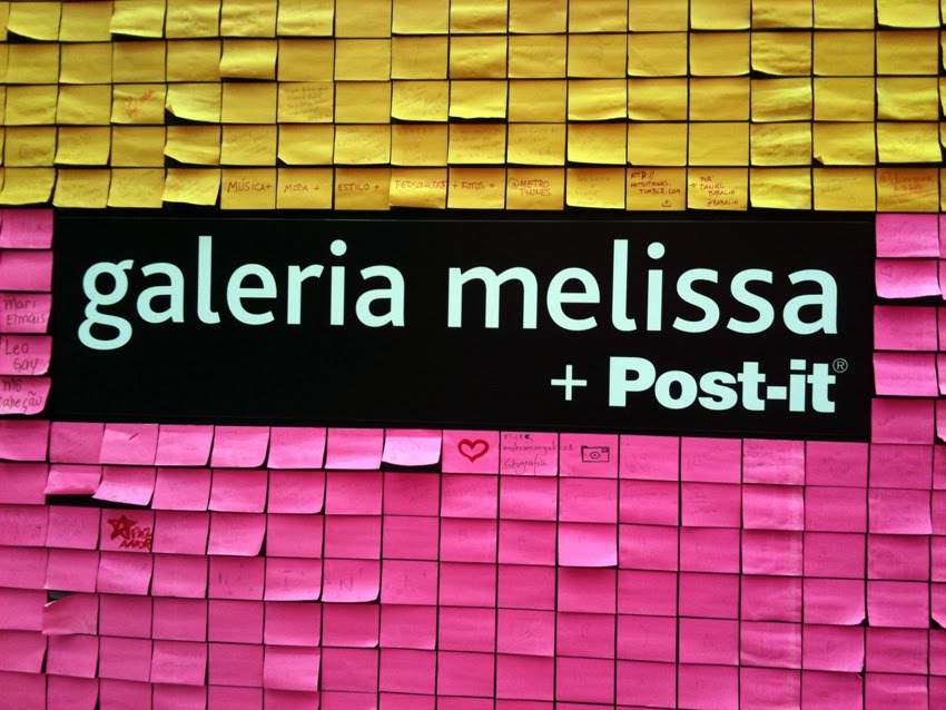 São Paulo é uma cidade que sempre inspira, mesmo ao meio do caos. E esse fim de semana, fomos dar uma volta pela cidade e olha só uma das coisas que encontramos: a fachada da Galeria Melissa, concept store, inteira coberta por Post it! Além do impacto visual ser super diferente, as pessoas podem deixar recadinhos nos papéizinhos coloridos espalhados por toda a entrada. Não resistimos!