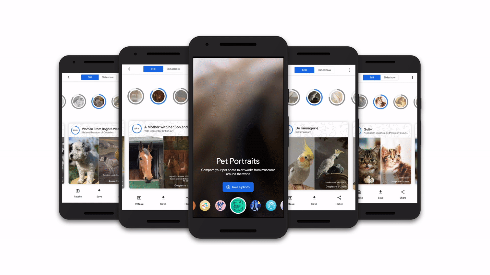 Cães, gatos, peixes, pássaros, répteis, cavalos ou coelhos podem descobrir seus próprios dublês entre dezenas de milhares de obras de instituições parceiras em todo o mundo. Seu companheiro pode ser encontrado em figuras egípcias antigas, arte de rua mexicana, aquarelas chinesas e muito mais. Além disso, o Pet Portraits convida você a aproveitar seu resultado para aprender sobre as histórias e artistas por trás de cada resultado.