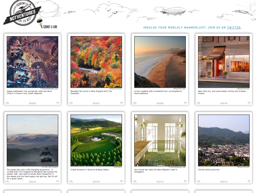 2) NOTVENTURES: Do mesmo império da inspiração do NOTCOT, o Notventures nos faz viajar através da web. Lugares maravilhosos, restaurantes, hotéis, cidades do mundo. Vale a pena escapar pra lá.