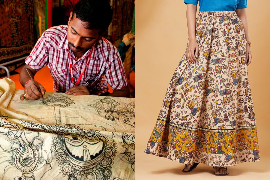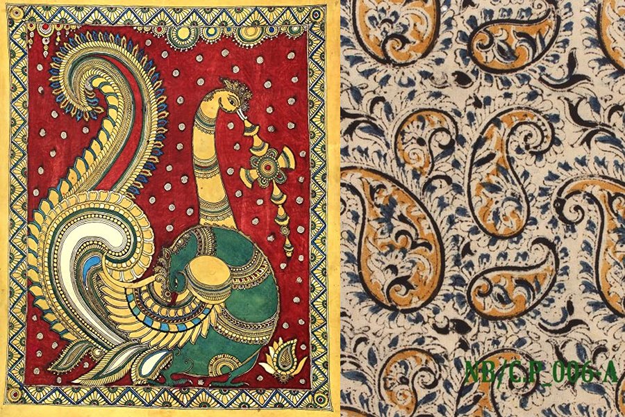 Kalamkari é um estilo dividido em duas vertentes: Srikalahasti e Machilipatnam (quem aí também leu bem devagar para conseguir acompanhar?). “Kalam” é referente à caneta e “Kari” se refere ao artesanal. A arte é conhecida e feita até os dias atuais.