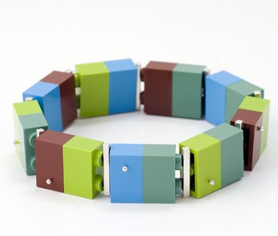 A designer de São Francisco, Emiko Oye transforma pecinhas de Lego + prata + borracha, em acessórios super coloridos, como brincos, pulseiras e colares. A combinação de cores e das peças que ela faz, ficam muito divertidas!