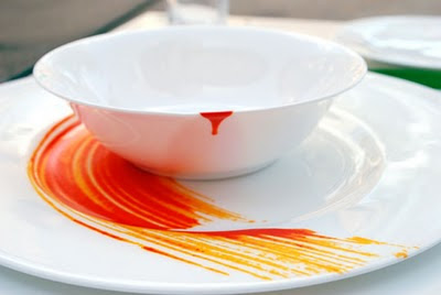Feitos em porcelana o desenho desses pratos, nos lembram algo assim: “alguém comeu hot dog com ketchup e mostarda aqui e não limpou direito, hein?”. O resultado do grafismo é no mínimo, diferente. Adorei!