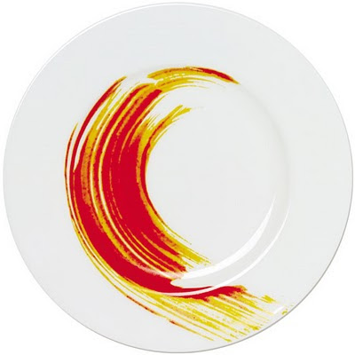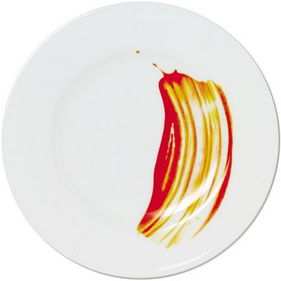 Feitos em porcelana o desenho desses pratos, nos lembram algo assim: “alguém comeu hot dog com ketchup e mostarda aqui e não limpou direito, hein?”. O resultado do grafismo é no mínimo, diferente. Adorei!
