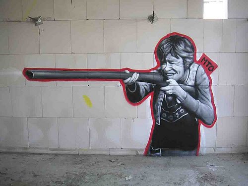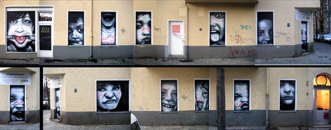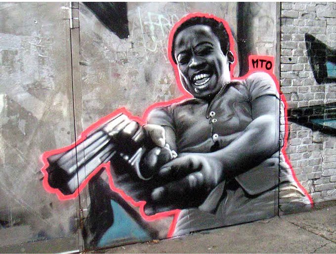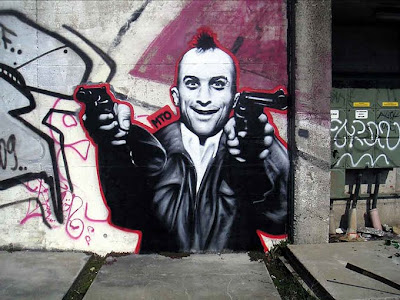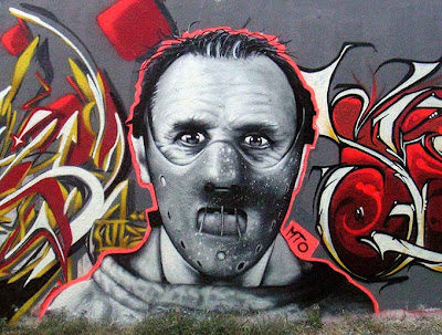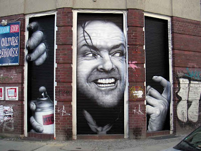 Pois é, isso é graffiti. Inspirado nas personalidades da indústria pop e dos cinemas, o artista MTO faz esses trabalhos maravilhosos pelas ruas de Berlim. Seus temas e filmes são de super bom gosto: O Iluminado, Taxi Driver, O Silêncio dos Inocentes. Nem mesmo o Zé Pequeno escapou!