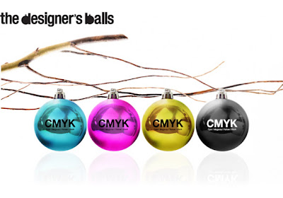 Bolinhas de natal para designers! São de plástico, medem 7cm e vem 1 Cyan, 1 Magenta, 1 Yellow e 1 black! Quero minha árvore assim! A criação é VeintiCuatroDientes.