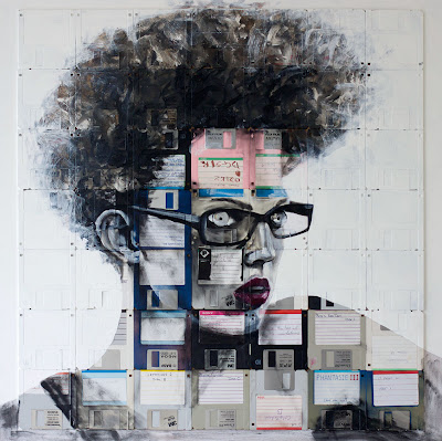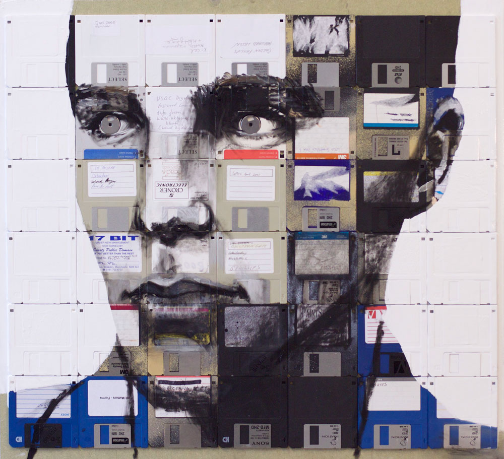 Não sabe o que fazer com os disquetes da época do colégio? Nick Gentry sabe. E ele faz arte usando os esquecidos disquetes, incorporando-os às suas pinturas, sem os descaracterizar. Geek art, my friends.