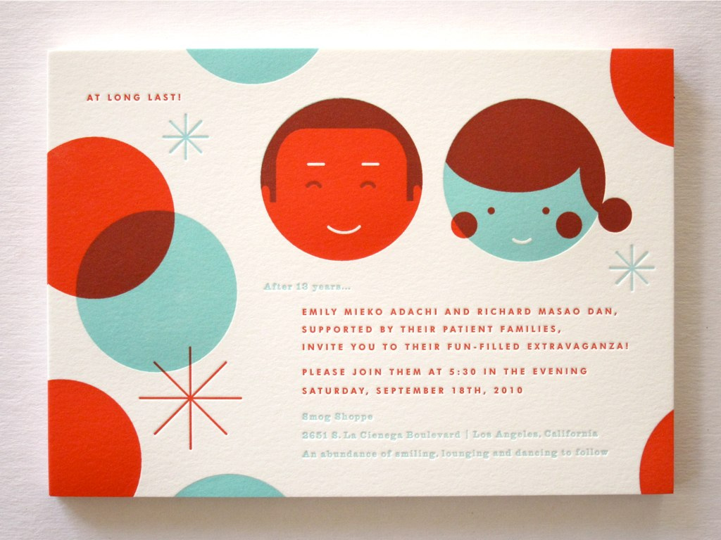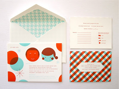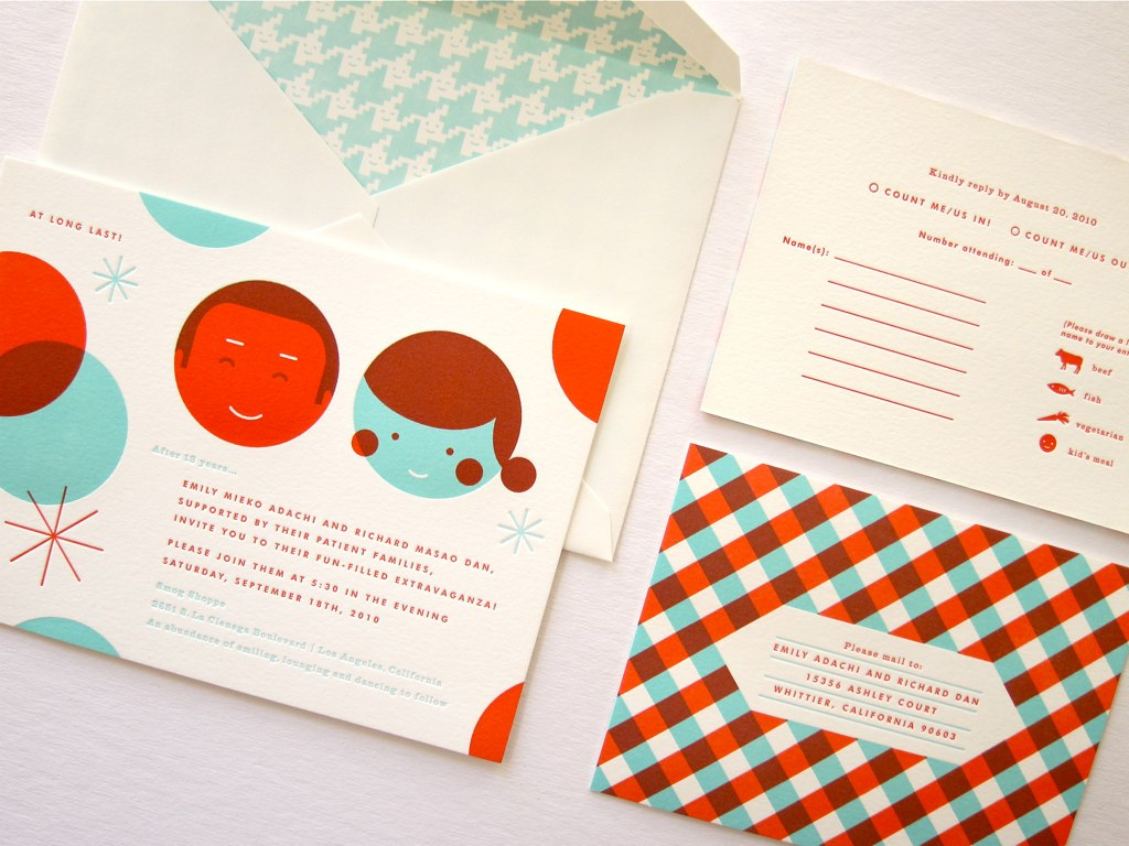 Apesar de ser um convite de casamento, gostei do design feito por Erinjang. O casal que ia casar adora pattern, design moderno, cores fortes e vintage. Pensando assim, o designer criou esse convite para expressar isso + o amor dos dois + a atmosfera do local da onde moravam, no caso Califórnia.