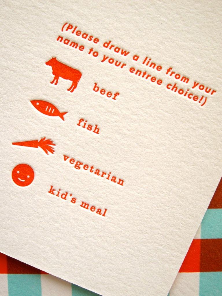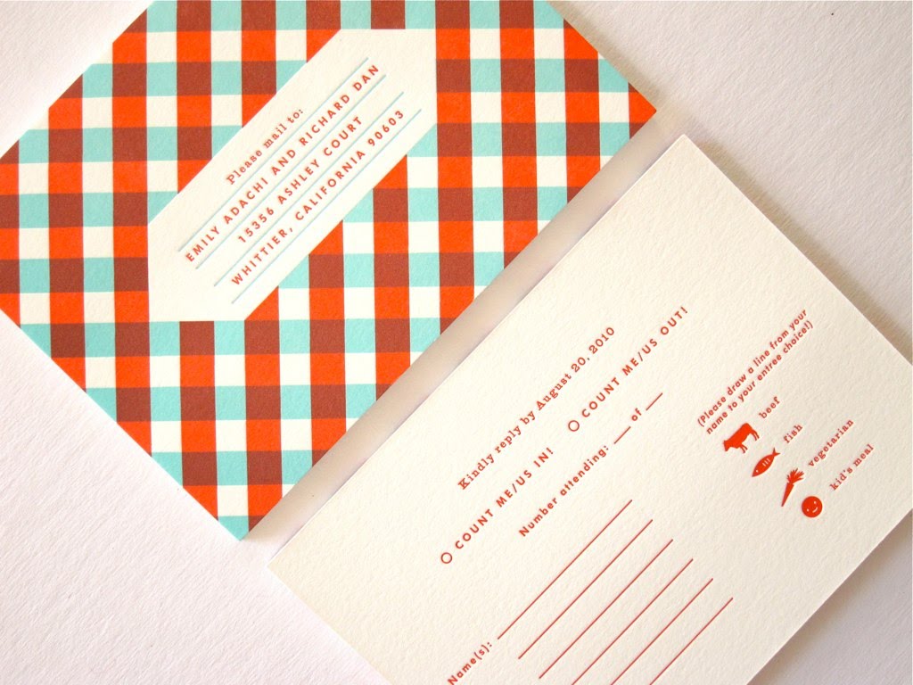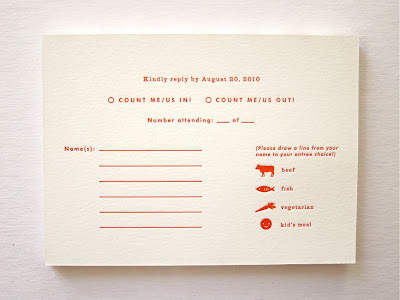 Finalmente! Ilustração dos dois seguindo o gosto do casal:Emily e Dan também queriam que seus convidados escolhessem o que gostariam de jantar em sua festa e os ícones foram criados justamente para isso! O cartão de RSVP: Conte comigo (ou não).Uma ilustração simpática foi feita para o envelope.Quem não teria vontade de ir numa festa com um convite legal como esse? Via FFFFound!