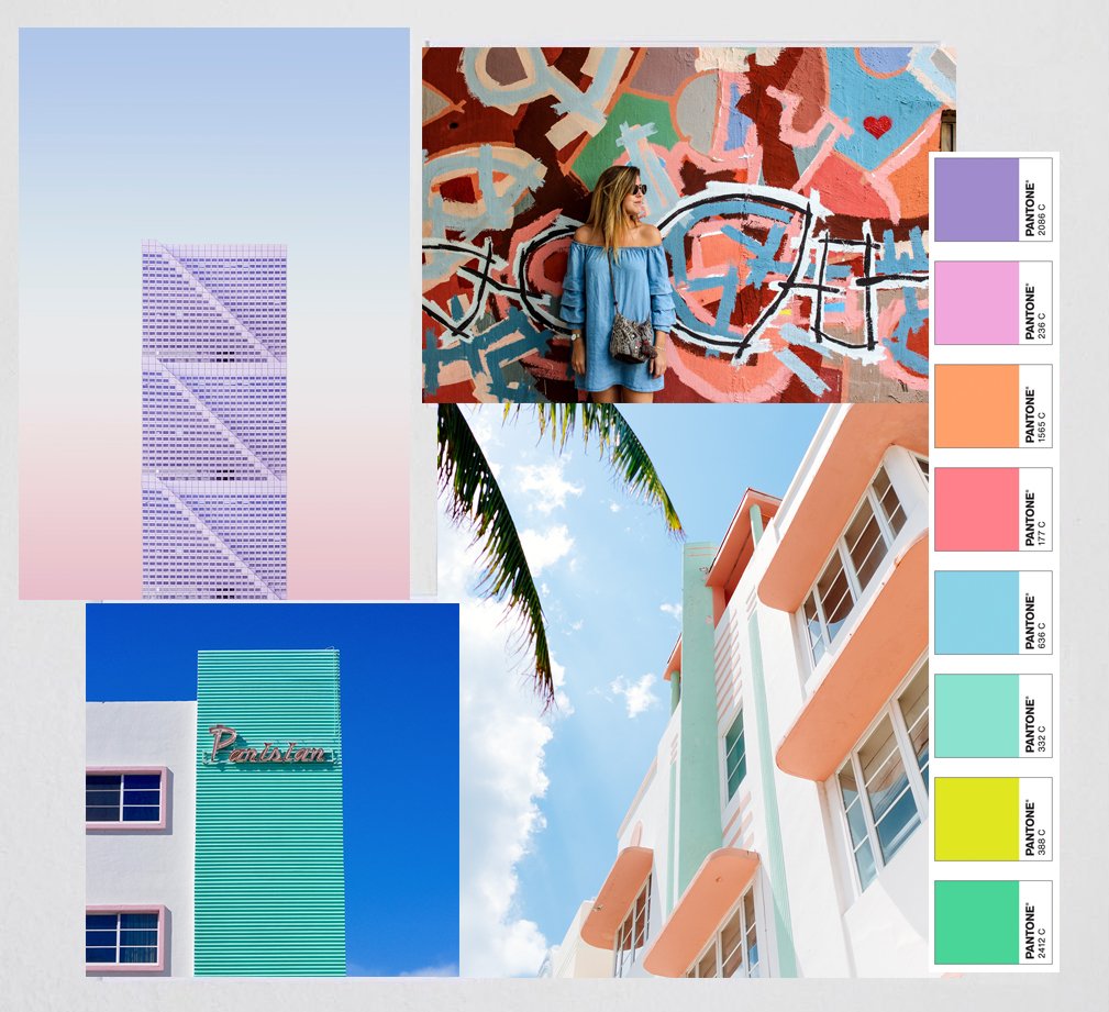 Cores como PANTONE 15-2213 Bonbon (PANTONE 236 C) e PANTONE 14-4514 Atomizer (PANTONE 636 C) poderiam ter pertencido a imagens que retratam a vida nas praias de Miami nos anos 80 ou lugares divertidos dos anos 90. Esse sentimento de nostalgia também contribui para a mensagem, trazendo um nível de conforto necessário e desejável.