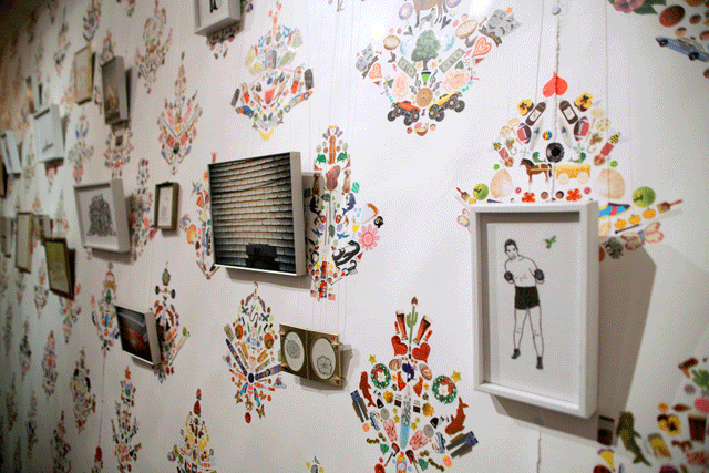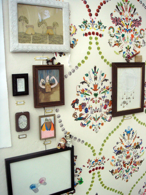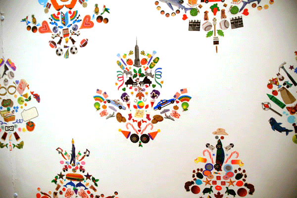 De longe, um papel de parede com uma estampa normal. Ao chegar mais perto, vemos que a estampa é toda formada por inúmeros adesivos. Colados um a um. A ideia foi exposta The Salon at Sundown, uma exposição multimídia de Brian Kaspr e Payton Turner que aconteceu em 2009, em Nova York. Adorei a diferença de estética do papel de parede longe-perto.