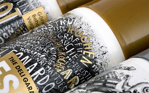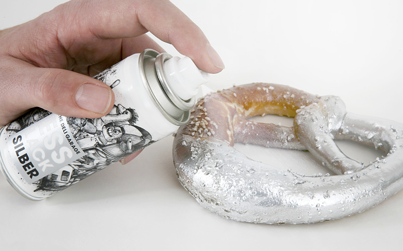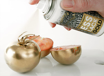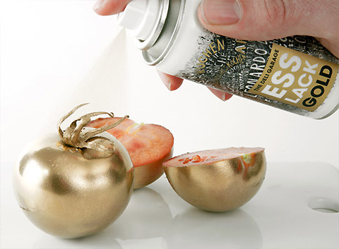 Que a gente gosta de cores, o próprio nome do blog já diz. Agora, que a gente gostaria de pintar alimentos… bom, juro que nunca tinha pensado nisso. Mas, o pessoal do Esslack Food Spray parece já ter tido essa ideia, não? Graças a The Deli Garage, cooperativa que ajuda produtores locais a terem uma imagem legal no mercado oferecendo design, embalagens, agora podemos pichar nossos tomates, salgados, ou qualquer outra coisa que chamamos de comida, que ficariam bons em tons de dourado e prateado! Toque de midas!