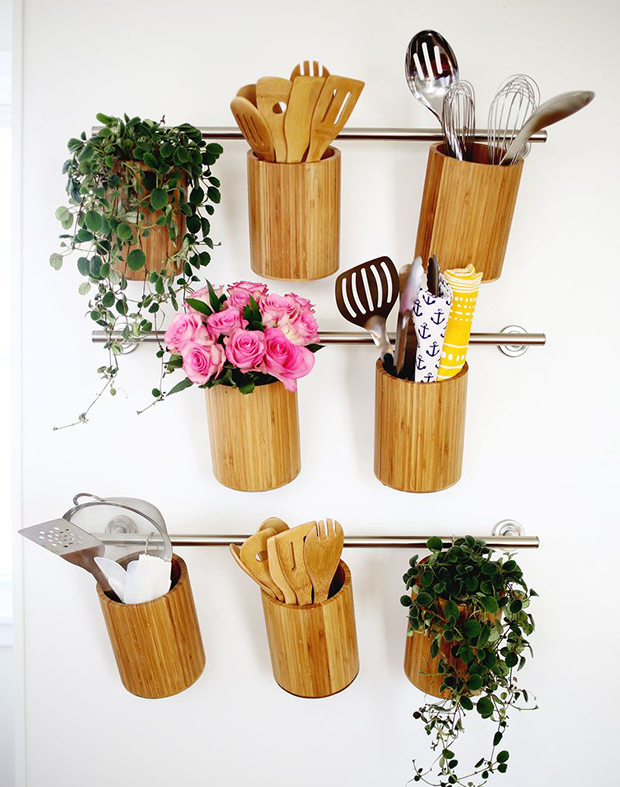 Sabe aqueles potes de madeira para organizar utensílios de cozinha como os garfos, colheres e facas? Esses mesmos objetos podem ser usados como suporte para a prateleira, você só precisa fixar barras na parede, como sugere o DIY do site A Beautiful Mess, e pendurar os potes com argolas.