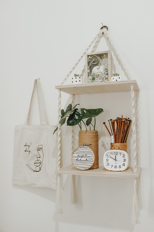 Os artesanatos fazem o maior sucesso, e porque não usá-los com funcionalidade? Aqui nessa ideia, você pode produzir prateleiras de macramê, basta usar dois ganchos presos na parede e um varão para pendurar o artesanato junto ao objeto de decoração, como por exemplo, as suculentas que estão super em alta na decoração de interiores.