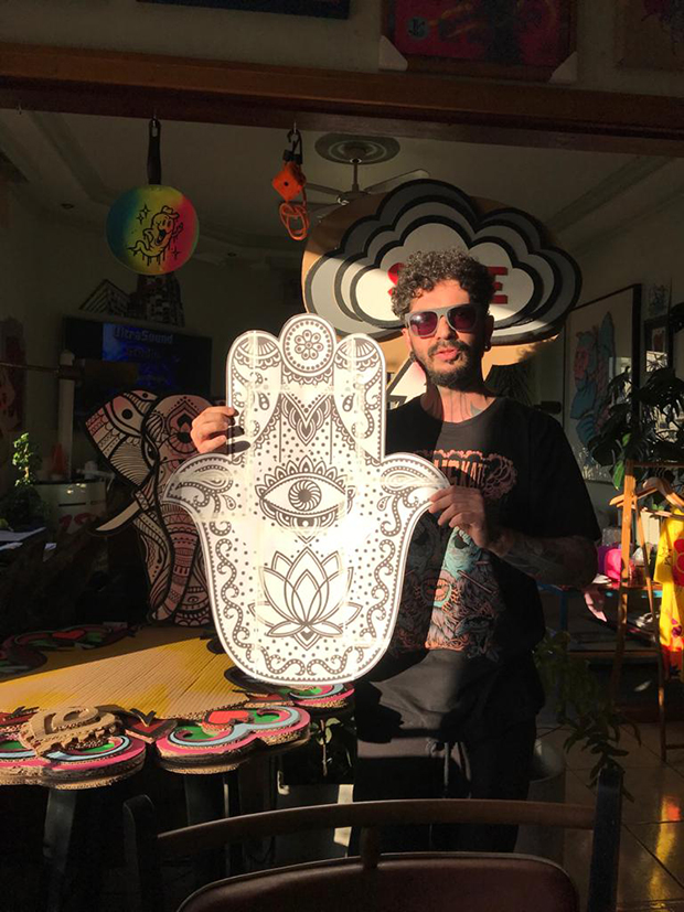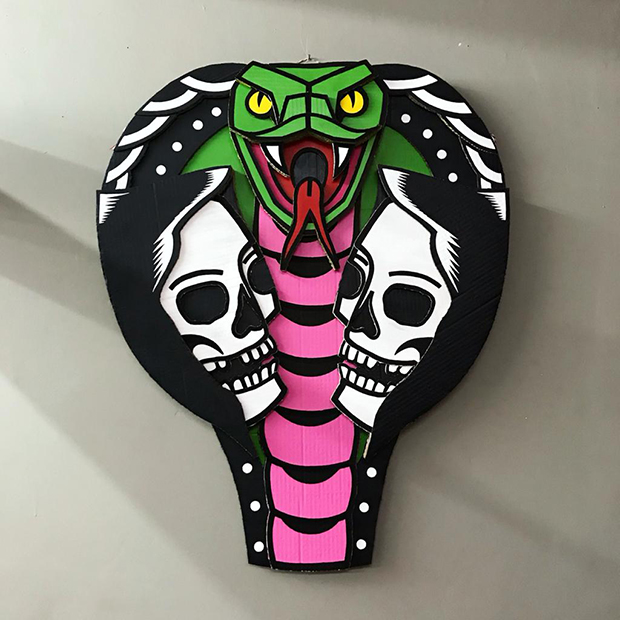 Uma alternativa sustentável e além disso, criativa. O Projeto Papelão é encabeçado pelo artista plástico e tatuador Edgar Camargo, proprietário do estúdio de tatuagem em São Paulo True Love Tattoo, que há alguns anos mescla desenhos de tattoo e recortes para criar imagens e esculturas de símbolos em camadas, resultando em um efeito de profundidade. O material é cortado à mão, com estilete ou bisturi, e as cores e traços tomam formas com látex, posca e spray.