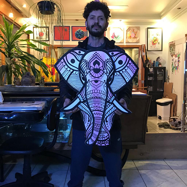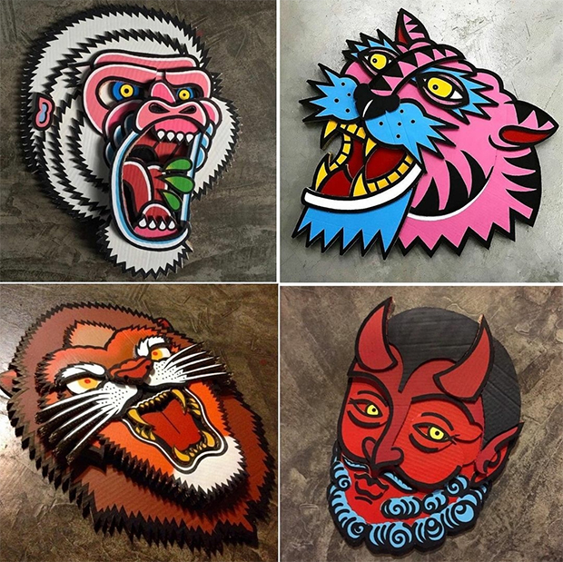 Uma alternativa sustentável e além disso, criativa. O Projeto Papelão é encabeçado pelo artista plástico e tatuador Edgar Camargo, proprietário do estúdio de tatuagem em São Paulo True Love Tattoo, que há alguns anos mescla desenhos de tattoo e recortes para criar imagens e esculturas de símbolos em camadas, resultando em um efeito de profundidade. O material é cortado à mão, com estilete ou bisturi, e as cores e traços tomam formas com látex, posca e spray.