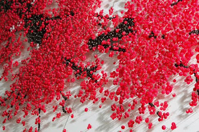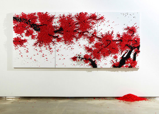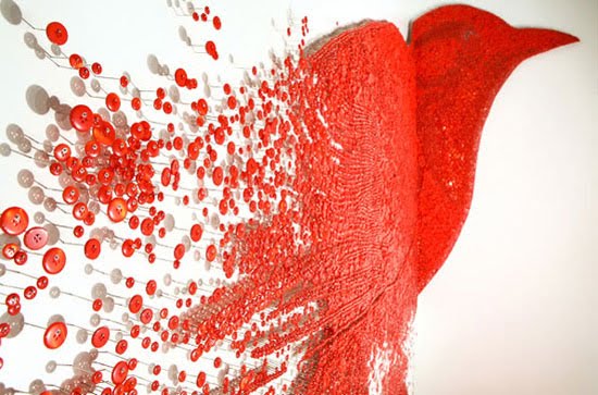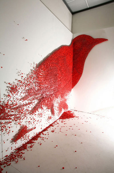 A artista plástica coreana Ran Hwang faz suas obras direto nas paredes dos lugares onde expôe seus trabalhos mundo afora. Os materiais que as compõem são objetos comuns como pregos, botões, alfinetes e cristais que formam imagens super cool como pássaros, árvores e candelabros. Demais.