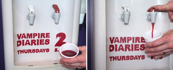 Para promover a série Vampire Diaries no canal TV2 Nova Zelândia, a agência Colenso BBDO teve a idéia de substituir a água natural de bebedouros por um suco vermelho, simulando sangue. Os bebedouros foram instalados em academias, salões de beleza, escritórios e outros locais públicos. A ação simples e direto ao target fez o maior sucesso.
