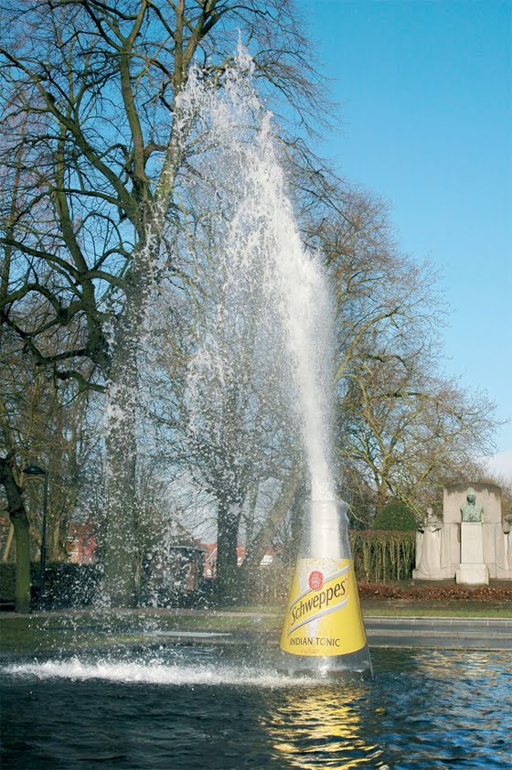 >Na Bélgica, a Schweppes usou uma fonte em um parque e uma super garrafa para promover o efeito “borbulhante” de sua nova tônica. Inteligente! Gostei!