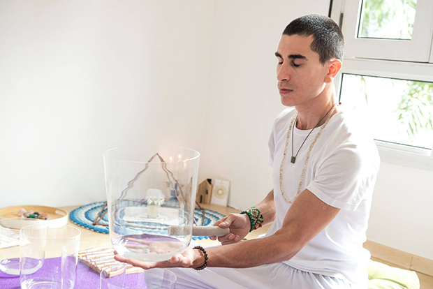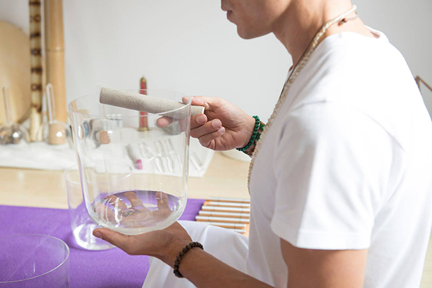 Agora na maca, fui convidada a fechar os olhos e relaxar ao som de cura que ele iria produzir com um set de oito tigelas de quartzo transparentes, cada uma afinada com a nota musical dos chakras; e uma nota específica que ressoa a tonalidade do mantra om; além de sete taças de cristal, que ressoam na quarta e quinta oitava musical, afinadas em escalas musicais super harmônicas para a aplicação do reike, que é potencializado pela energia do quartzo.