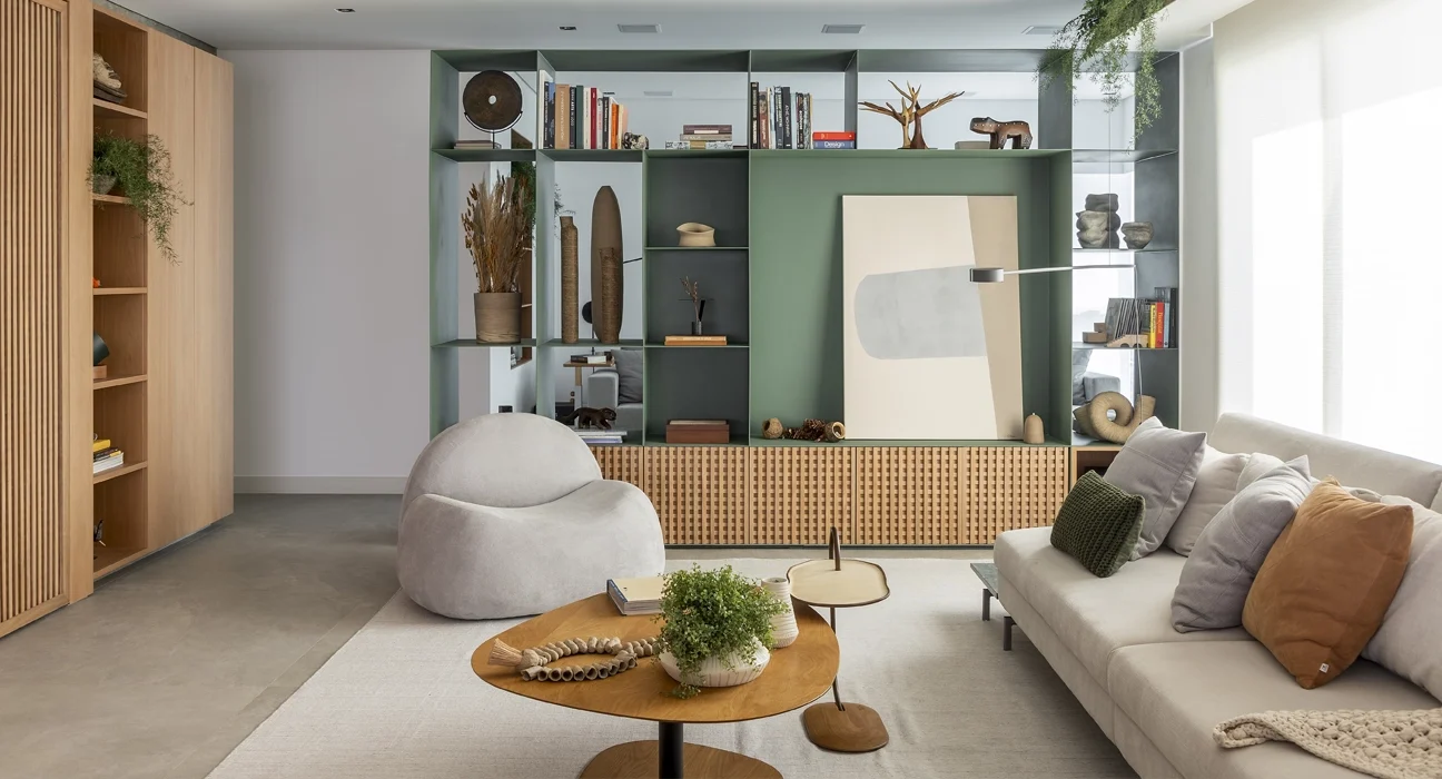Este não é um móvel qualquer: trata-se de uma cristaleira verde-oliva, pensada pela arquiteta Cristiane Schiavoni para ser a personagem principal nesse apartamento. Integrada ao mobiliário com o ‘L’ que forma com a parte inferior, ela oferece compartimentos estratégicos, guardando desde o essencial do dia a dia até os calçados logo ao chegar em casa.
