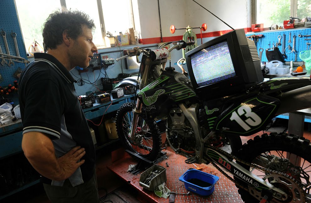 Giorgio Rovida, um mecânico de motos, assiste ao jogo em sua loja em Milão.