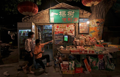 Casal chinês veem o jogo em Beijing, China, do lado de fora da sua mercearia.