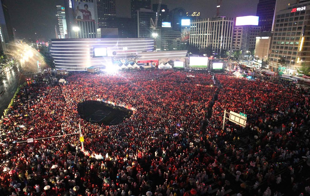 Fãs da Coréia do Sul torcem pela vitória da Coréia do Norte contra a Grécia em Seul.