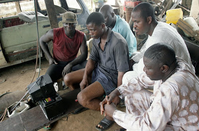 Mecânicos e clientes assistindo a partida entre Argentina e Nigéria. (Nigéria)